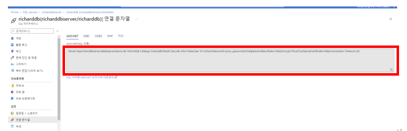 azure db -> 연결 문자열 복사 클릭