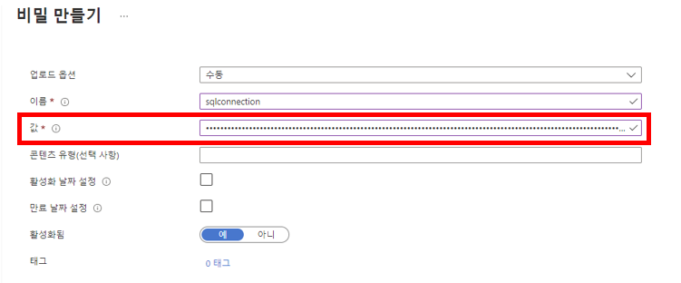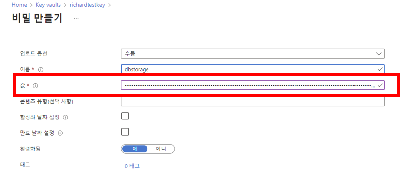 key vault -> 비밀로 가서 새로만들기 클릭