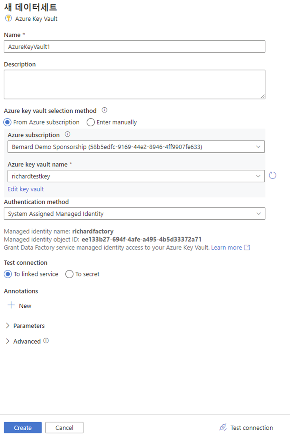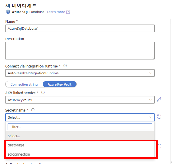 key vault를 선택하면 새 데이터 세트를 생성해야하는데 다음과 같이 생성한다.