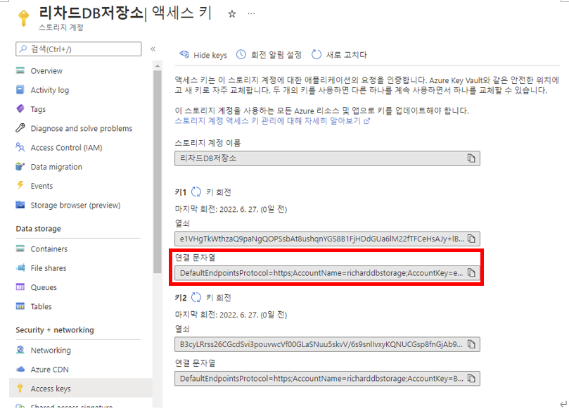 스토리지 계정 -> Access keys -> 연결 문자열을 복사한다.