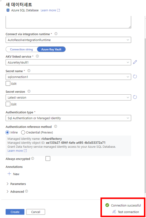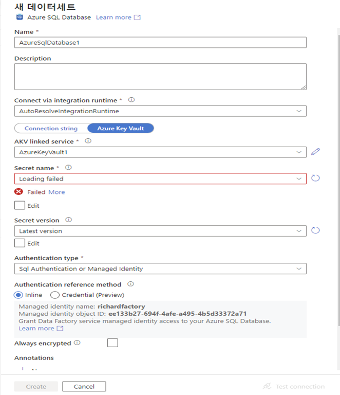 만들기를 누르면 현재 key vault에 대한 권한이 없어 ADF가 불러오지 못한다.
