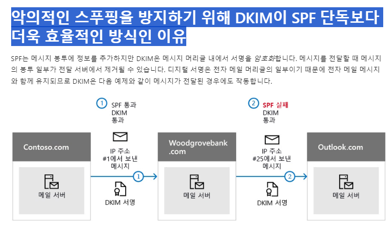 DKIM은 공격이 도메인에서 발송된 것 같은 메시지를 보내지 못하도록 도와주는 SPF, DKIM 및 DMARC(인증 방법) 중 하나입니다.