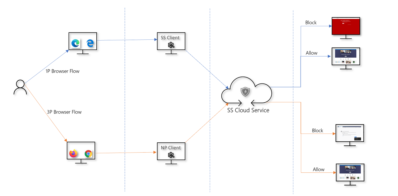 웹 위협 방지는 Microsoft Edge 및 Chrome 및 Firefox와 같은 인기 있는 타사 브라우저와 통합하여 웹 프록시 없이 웹 위협을 중지하고 멀리 있거나 온-프레미스에 있는 동안 디바이스를 보호할 수 있습니다.