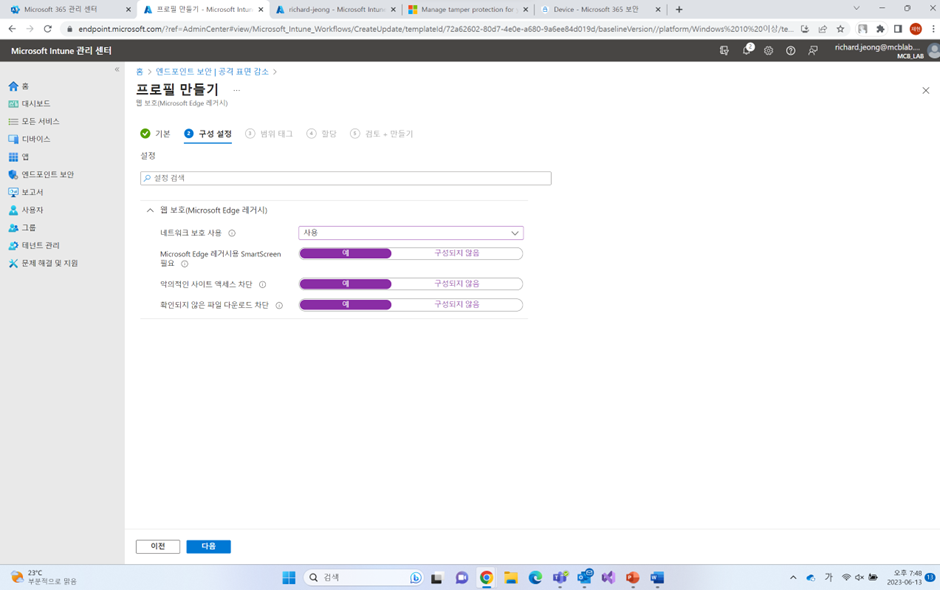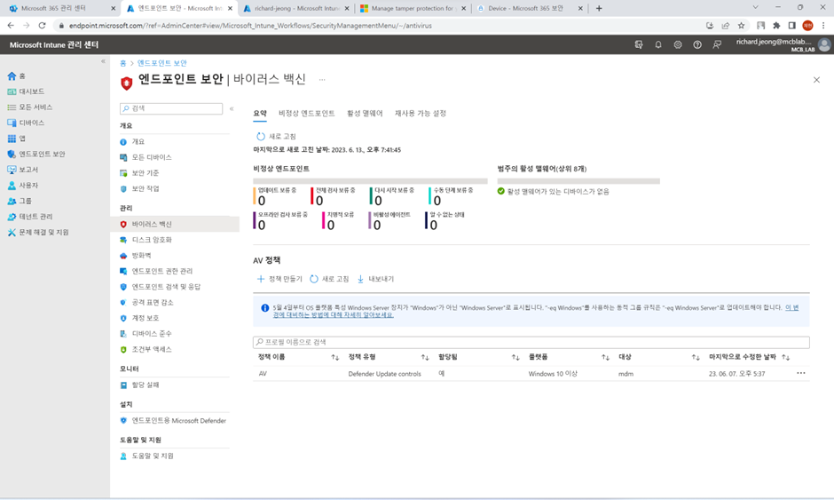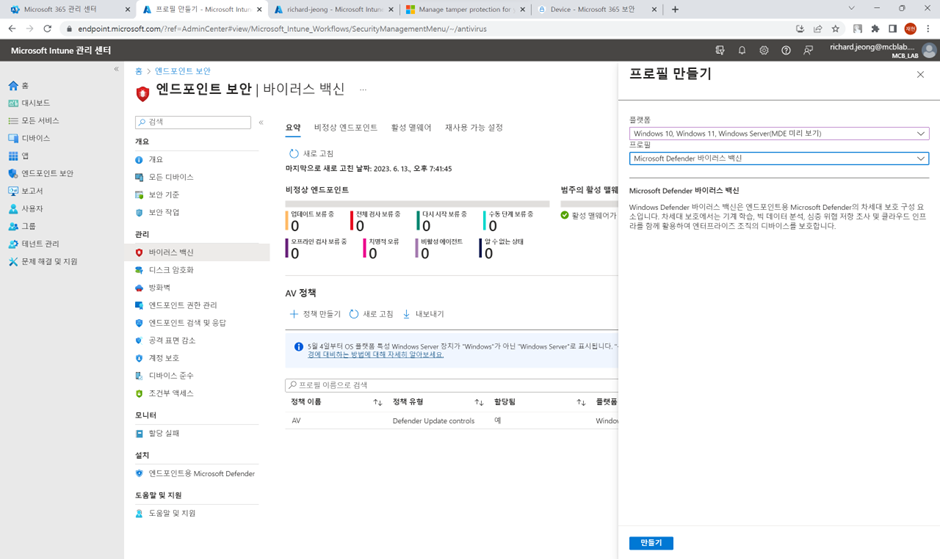 먼저 Intune 엔드포인트 보안에서 바이러스 방지 정책을 설정해야합니다.