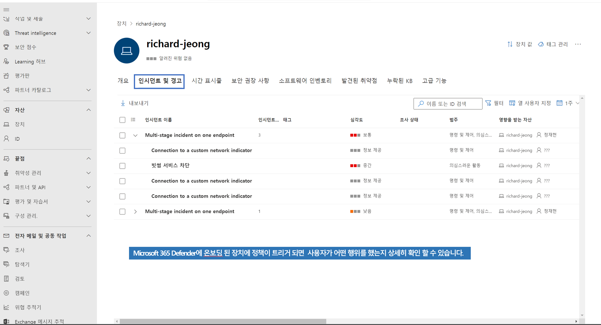 빅데이터와 장치 학습, 그리고 Windows 에코시스템과 Office 365 등 기업 클라우드 제품, 온라인 자산 전반의 Microsoft만의 눈을 활용하여 행동적 신호를 해석하고 인사이트와 검색, 지능형 위협에 대한 권장 조치를 생성합니다.