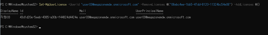 Set-MgUserLicense -UserId "user03@megazonemdw.onmicrosoft.com" -AddLicenses @{SkuId = "06ebc4ee-1bb5-47dd-8120-11324bc54e06"} -RemoveLicenses @()