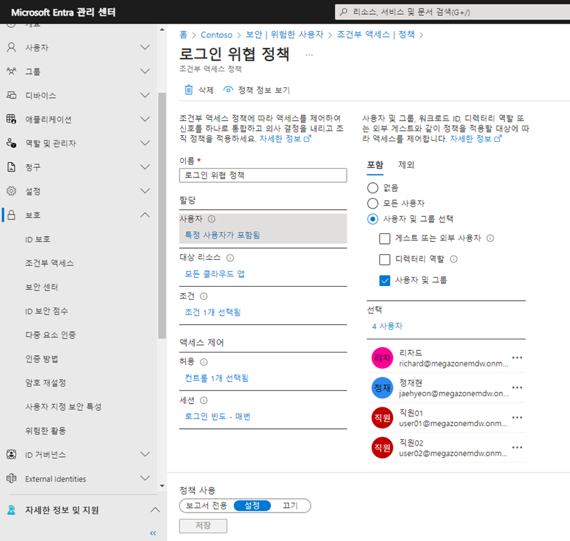 조건부 액세스 정책에 사용자위험, 로그인 위험을 만듭니다.