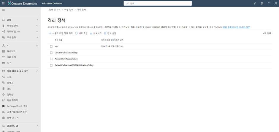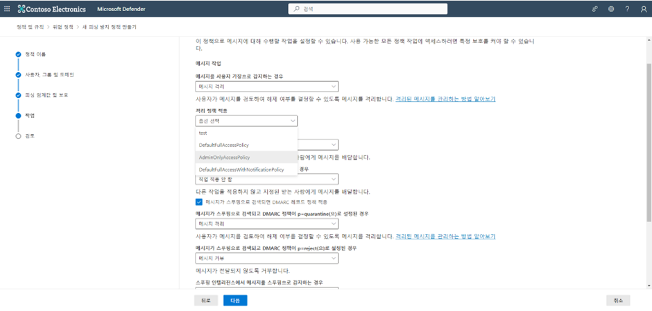 메일 격리를 선택했다면, 기본값을 선택해도 되고, 관리자가 만든 사용자 지정 격리 정책을 선택할 수 있습니다.