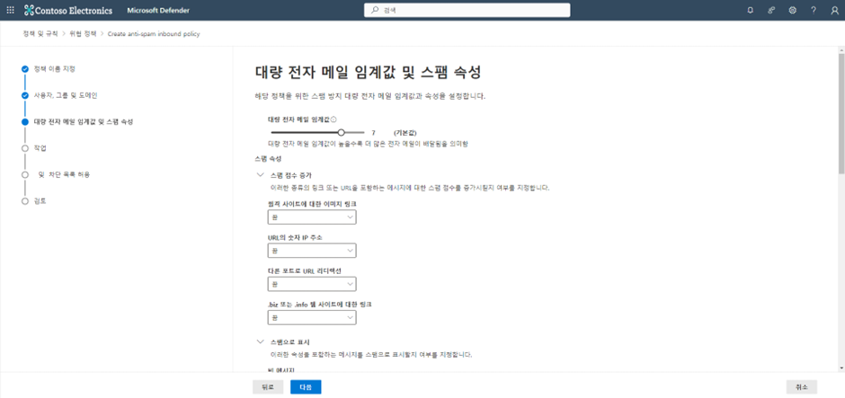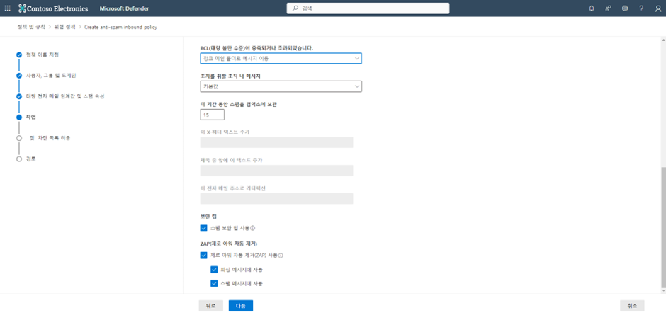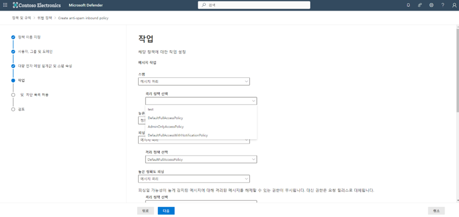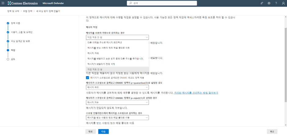 스팸 메일이 감지되면 해당 정책에 대한 작업 설정을 합니다.