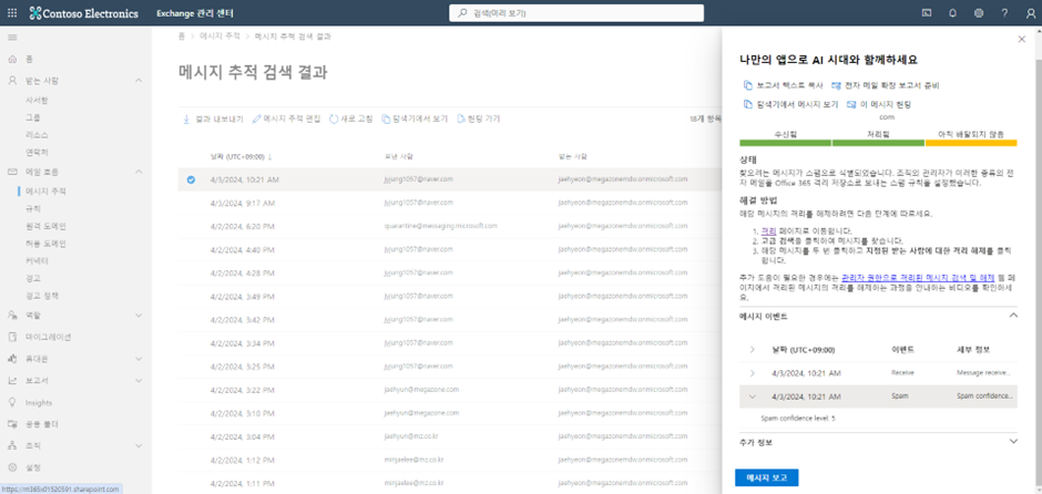 Exchange Online 관리센터에서 메시지 추적 확인결과 스팸으로 분류되어 메일이 정책에 의해 격리되었습니다.