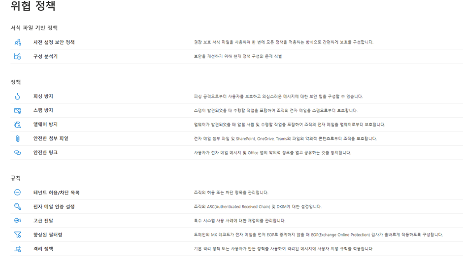 우선 항목들이 바로 메일과 많은 연관된 부분들입니다. EOP(Exchange Online Protection)는 Microsoft 365 구독에 대한 보안의 핵심이며 악의적인 전자 메일이 직원의 받은 편지함에 도달하지 못하도록 하는 데 도움이 됩니다.
