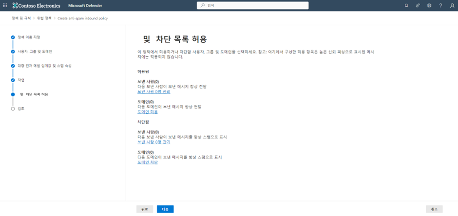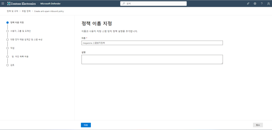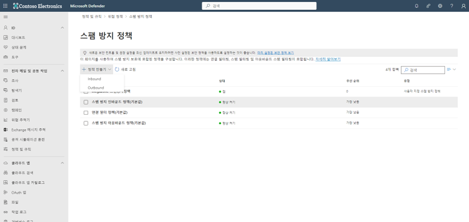 Microsoft 365 Defender 관리센터 ->전자 메일 및 공동 작업 -> 정책 및 규칙 -> 위협정책 -> 스팸 방지 -> 정책 만들기 클릭합니다.