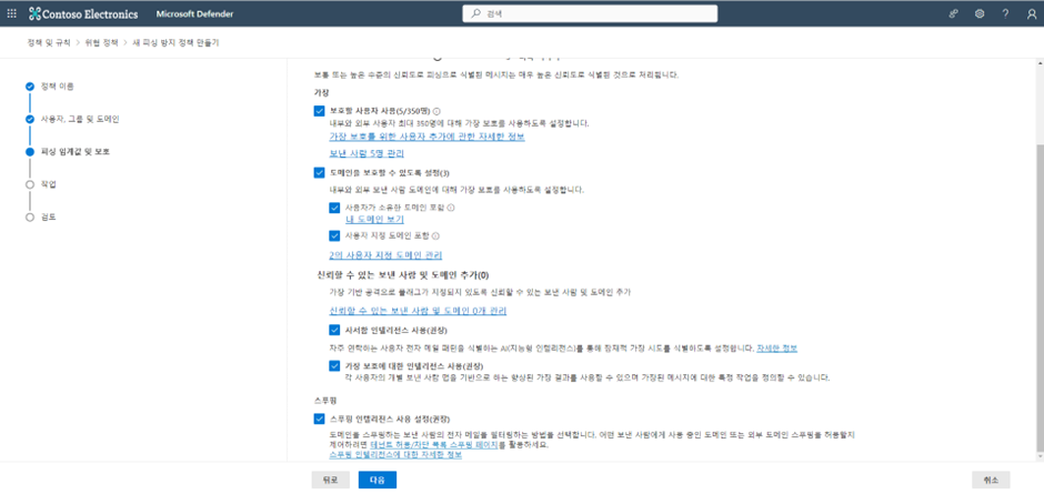 정책은 피싱 방지, 스팸 방지, 맬웨어 방지, 안전한 첨부 파일, 안전한 링크 입니다.