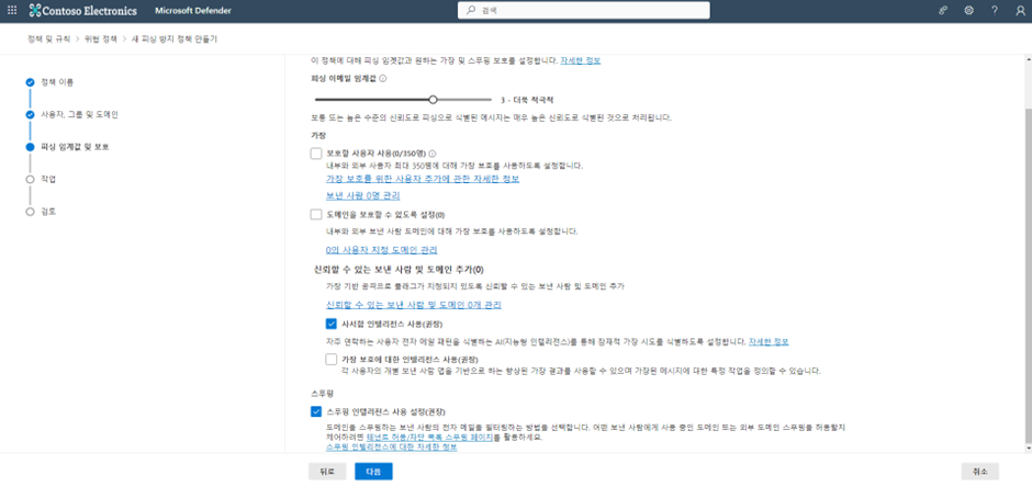 피싱 이메일 임계값을 조절하여 보통 또는 매우 적극적으로 할지 설정합니다.