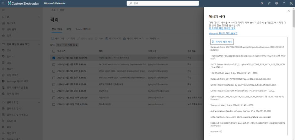 검토 페이지에서 격리된 메시지의 헤더를 복사합니다.