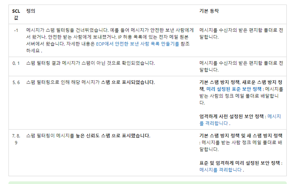 SCL 값의 높을수록 메시지가 스팸일 가능성이 높다는 것을 의미합니다.