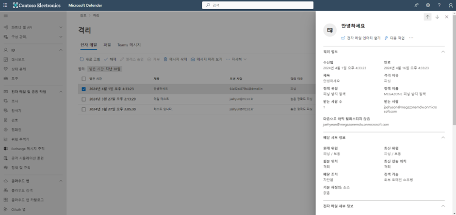 Microsoft Defender 관리센터 -> 전자 메일 및 공동 작업 -> 검토에서 자세한 격리 사항들을 확인할 수 있습니다.