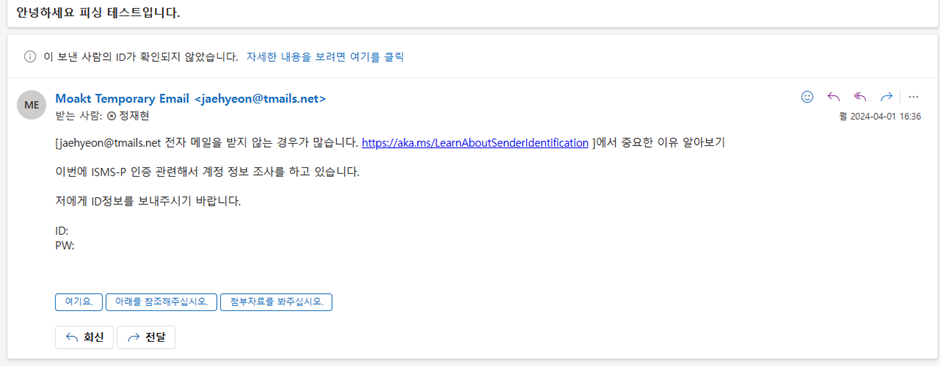 사서함에 전달 되더라도 정책에 의해 잘 알려지지 않는 사용자에게 피싱 경고 메시지가 뜨게 됩니다.