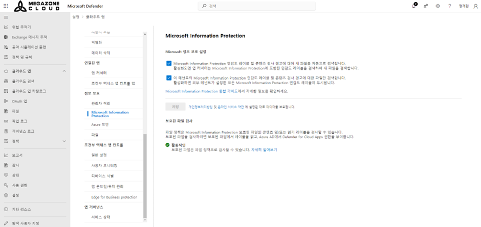 Microsoft 365 Defender 관리센터 -> 설정 -> 클라우드 앱 -> 정보 보호 -> Microsoft Information Protection 클릭