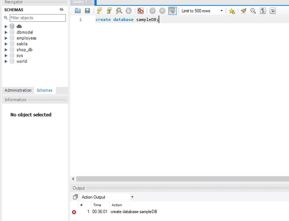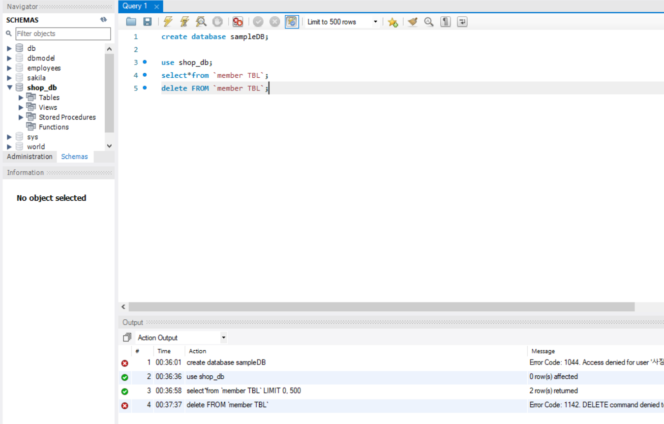 데이터 베이스를 생성할려고해도 권한이 없기 때문에 거부가 된다.