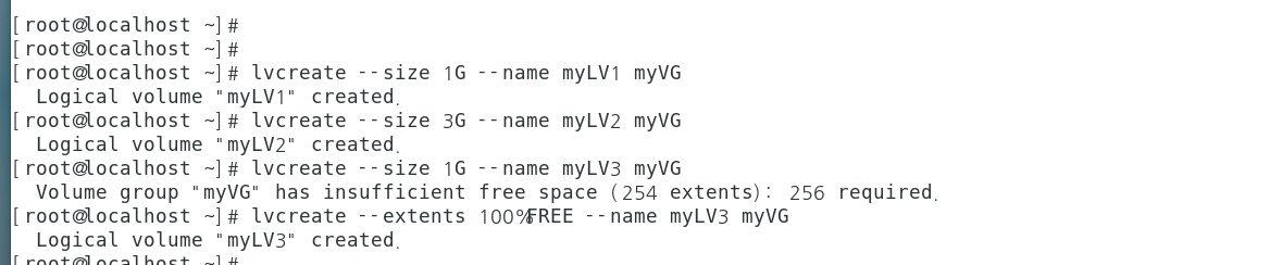 --extents 100%FREE -> 1GB로 설정했지만 남은용량이 1GB가 안돼서 남은용량 100%을 사용하겠다는 뜻이다.