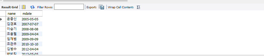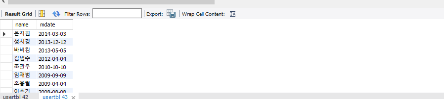 select name , mdate from usertbl order by mdate; -- 가입일이 빠른 순서대로 출력한다. (기본은 오름차순 빠른것부터 출력)