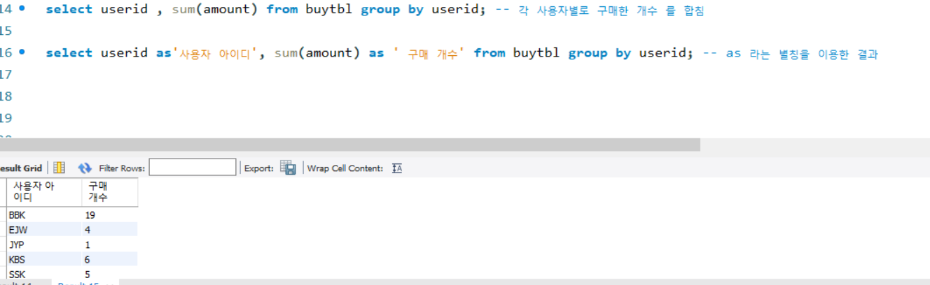 sqlDB의 구매테이블 에서 사용자 가 구매한 물품의 개수를 보려면