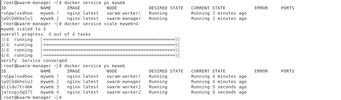 #docker service scale myweb=4 //레플리카를 4개로 늘림