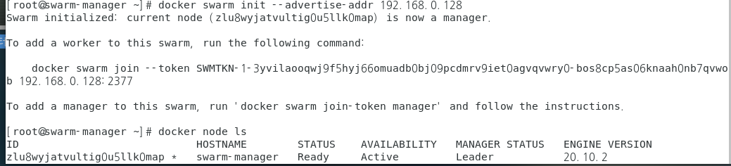docker swarm join --token SWMTKN-1-4jn365c7so7i90ndne7tefm7d9ywkii9a45lfxhjyxv69zefsq-7pt6dc17rwr03yn3hpeeo31y0 192.168.0.128:2377