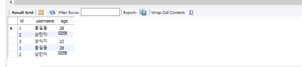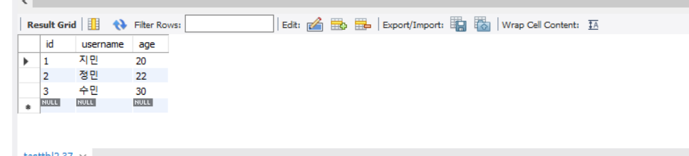 insert into testtbl1(username,age,id) values('상식이',22,3);
