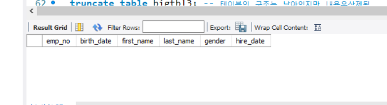 truncate table bigtbl3; -- 테이블의 구조는 남아있지만 내용은삭제됨