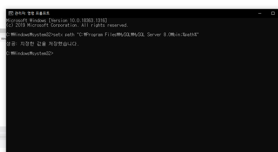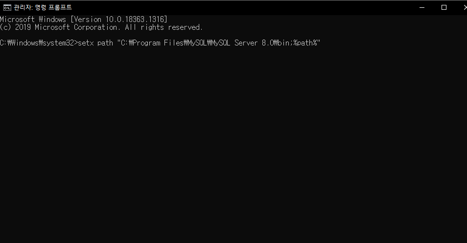 관리자 권한으로 실행해서 mysql 이 설치된 경로를 입력해주셔야합니다. \bin;%path%" :이게아니라 ; 입니다.