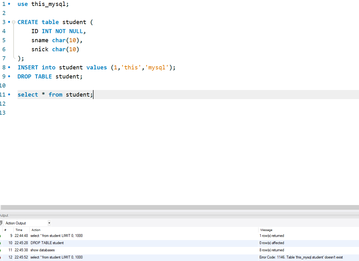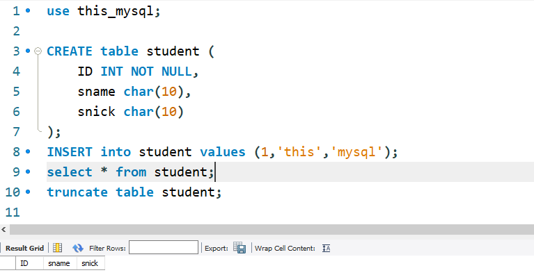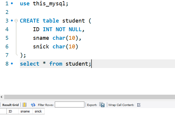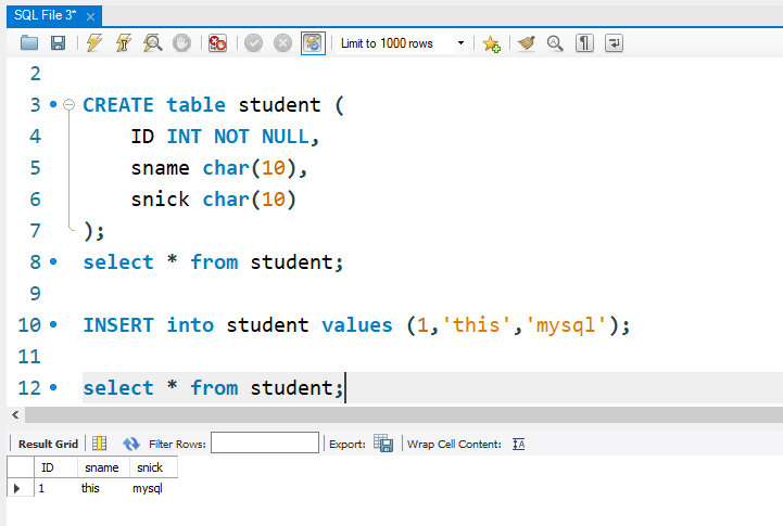 SELECT * from student; // 아래 ID, sname , snick 이 생성이 되었다.