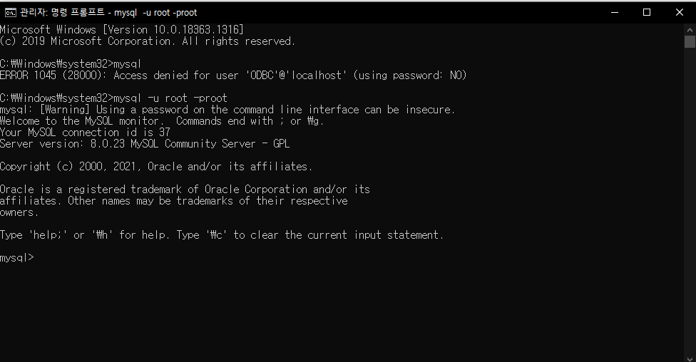 윈도우 프롬프트에서 mysql 실행하기