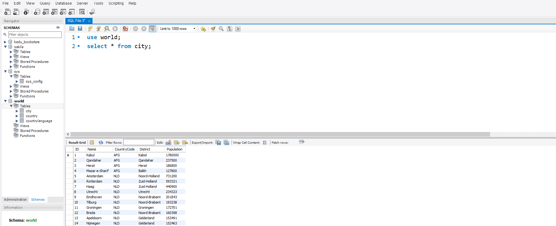 use world; // world 라는 테이블을 실행 하겠다. ctrl + enter 치면 실행이된다.
