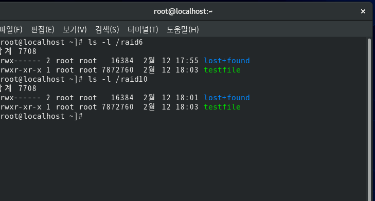 이제 raid 6 , 10 의 디스크를 고장내고 안에있는 testfile 이 정상적으로 작동되는지 확인해 보자