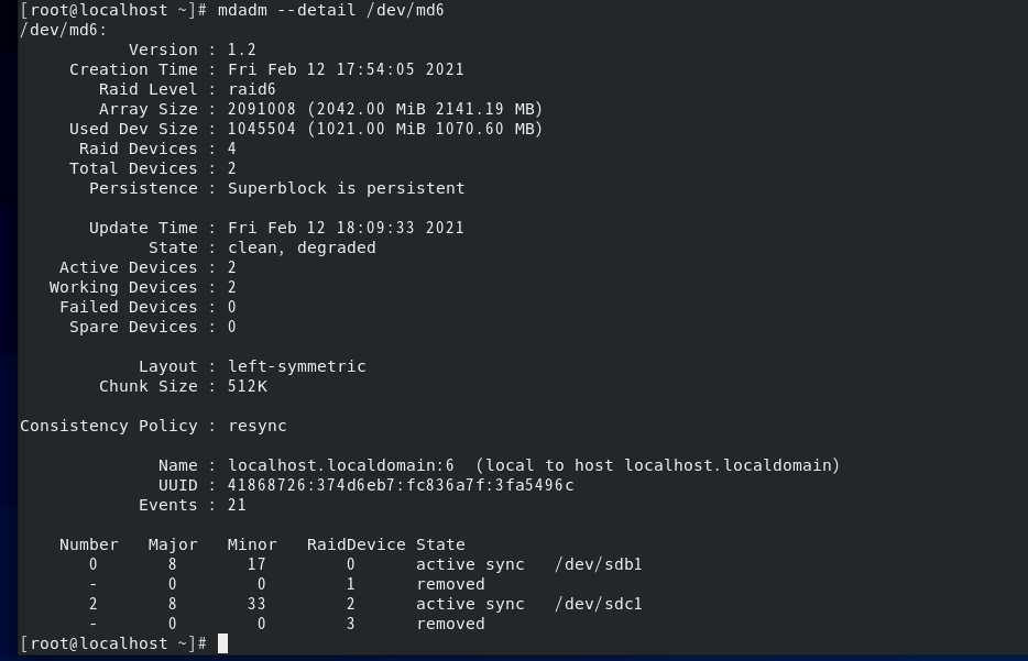 mdadm --create /dev/md6 --level=6 --raid-device=4 /dev/sdb1 /dev/sdc1 /dev/sdd1 /dev/sde1 //생성