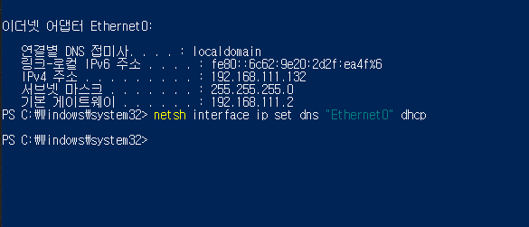 netsh interface ip set "Ethernet0" dhcp 를 입력해주면 된다.