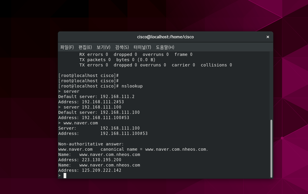 www.naver.com의 의 주소를 요청했더니 정상적으로 작동함을 알 수 있다.