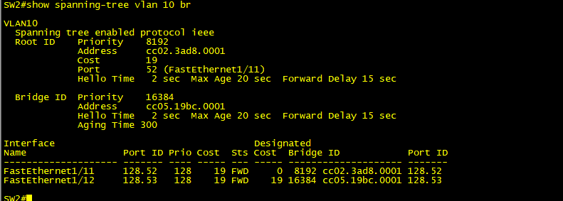 VLAN 10 에대해서는 F1/12 포트가 대체포트이고, F1/13 이 루트 포트가 되었다.