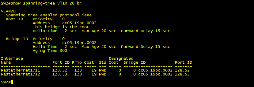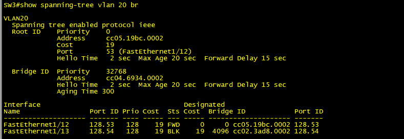 VLAN 20 에대해서는 F1/12 포트가 루트 포트이고, F1/13 이 대체 포트가 되었다.