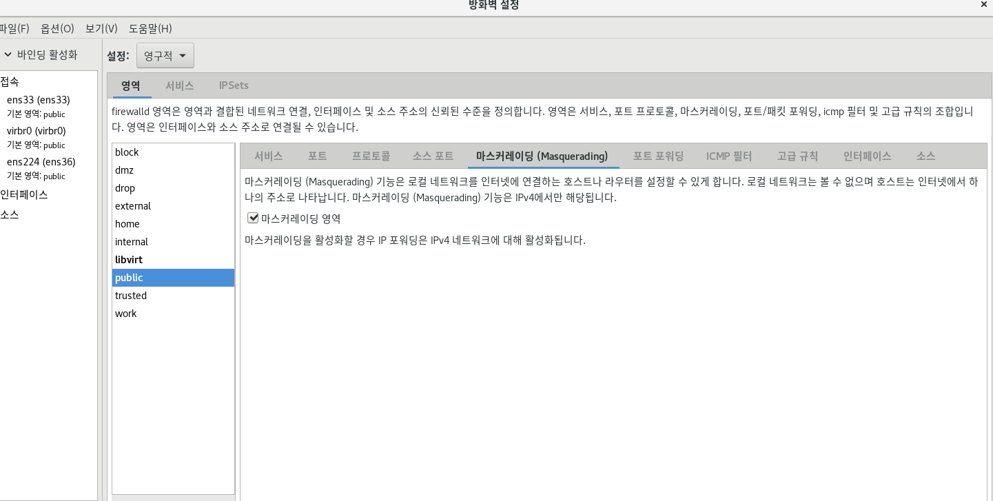 방화벽 pc 에서 방화벽을 열어서 마스커레이딩 체크