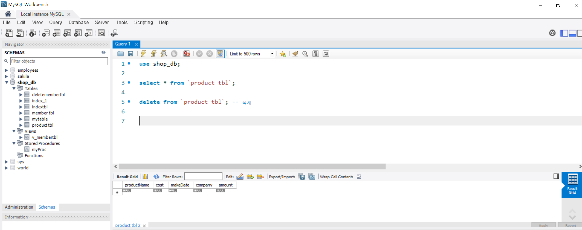 다시 select * from `product tbl` ; 하면 데이터가 복원 되었다.