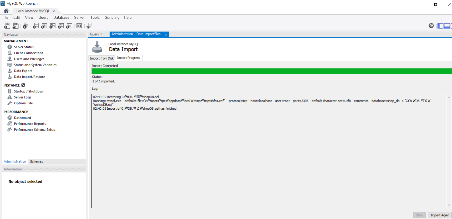 디폴트 타겟 경로를 shop_db를 선택해주고 아까 저장한 sql 파일을 선택하고 복구시켜준다.