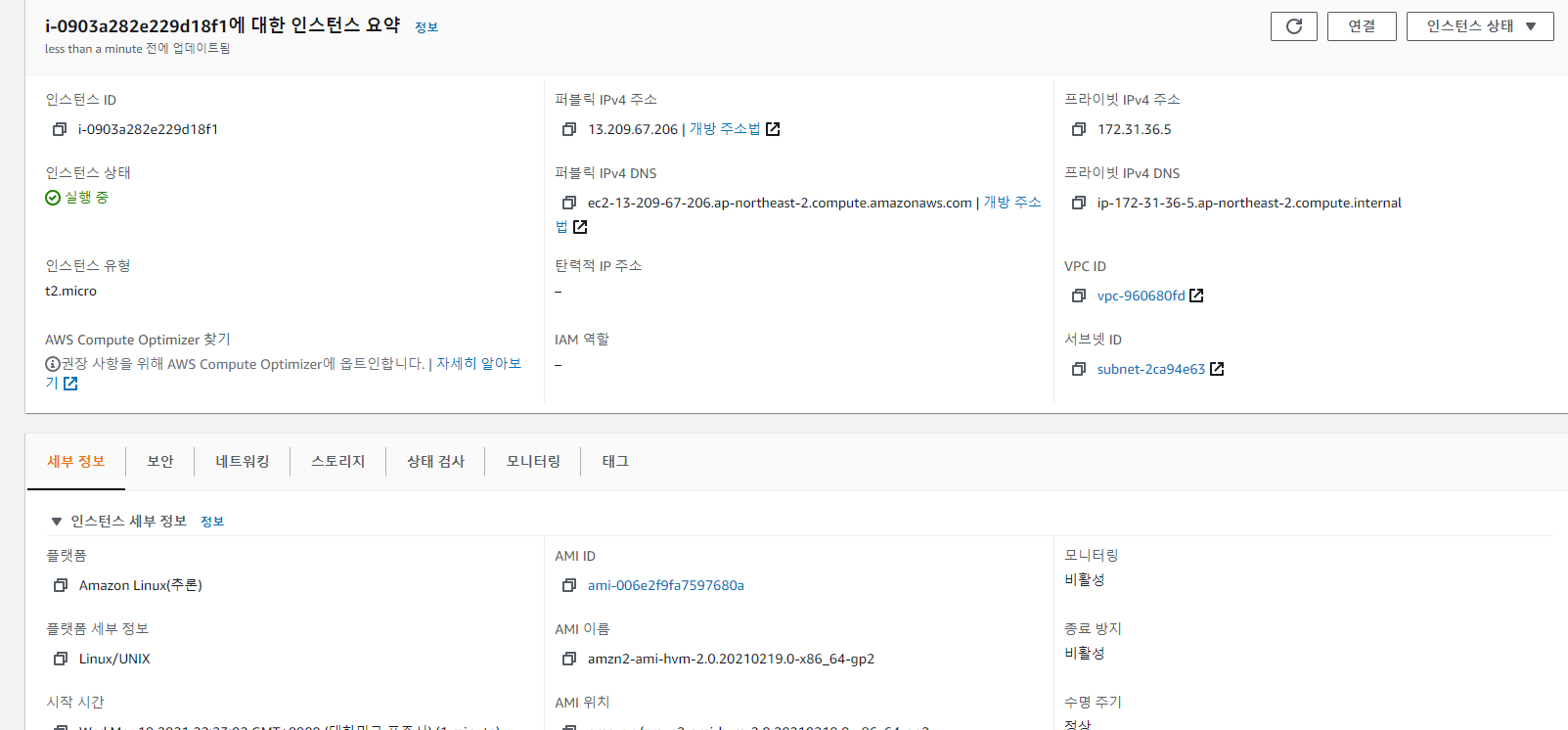 인스턴스 id 를 클릭하면 인스턴스 세부정보를 볼 수 있다.