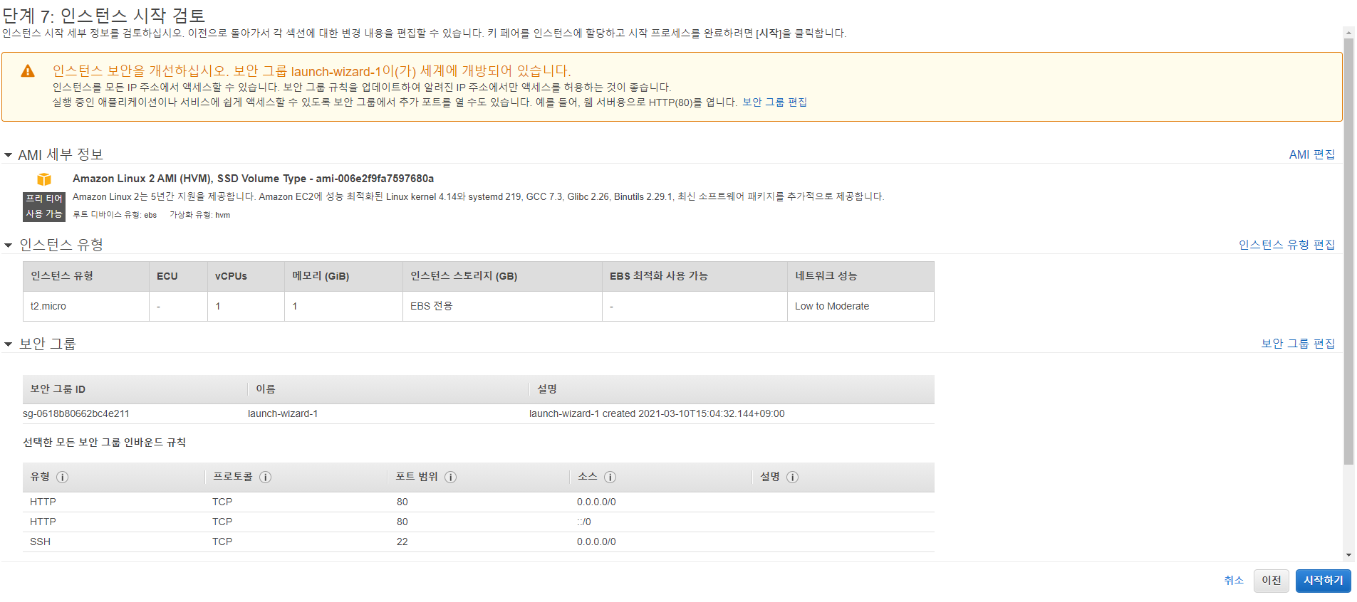 기존 보안그룹을 사용할 수 있고 새롭게 추가할 수 있다. 새롭게 추가하면 키페어를 다시만들어야하니 주의한다.