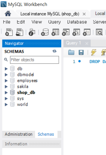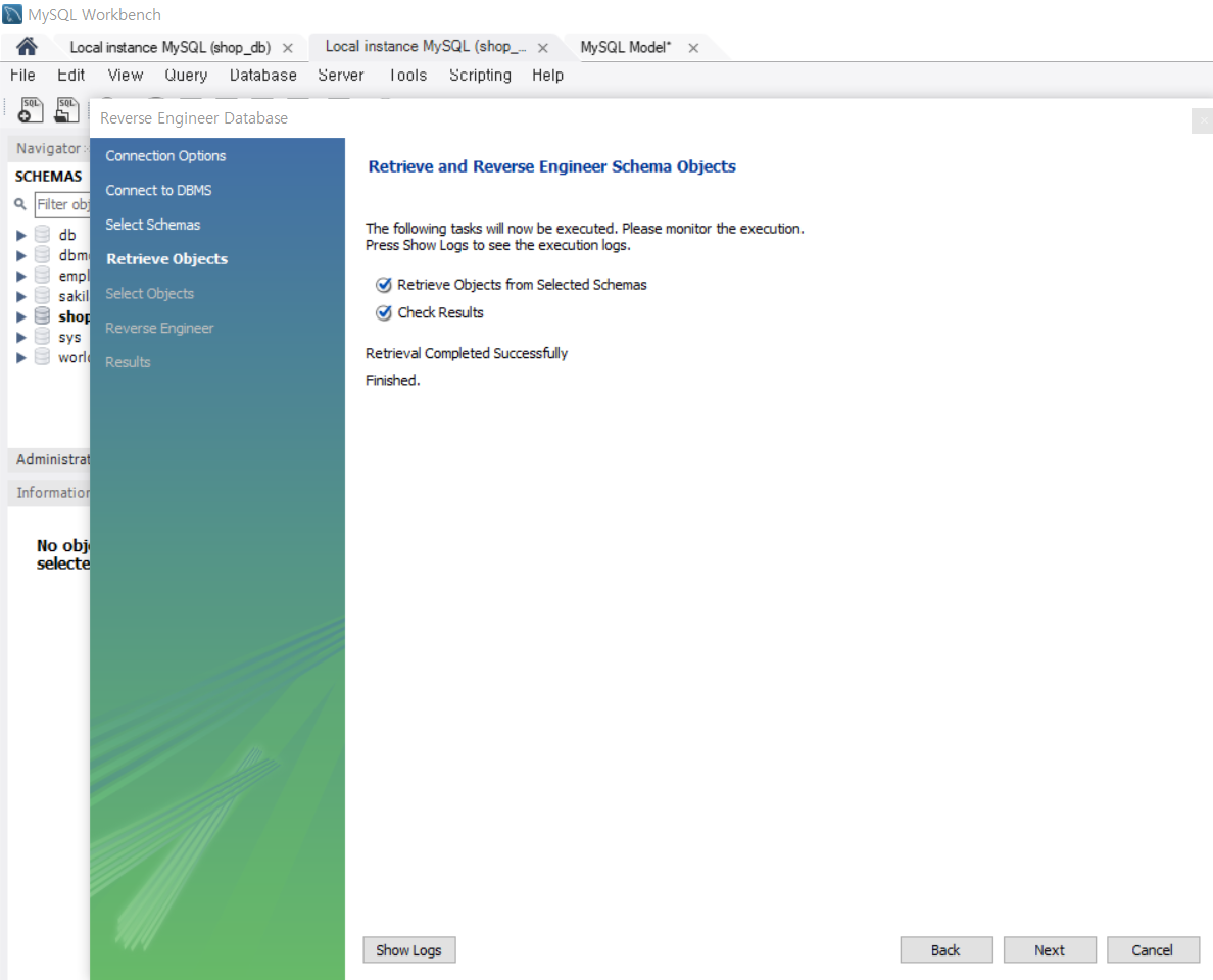 다시 schemas로 가서 리프레쉬 버튼을 눌르면 dbmodel이라는 database가 생성되었다.