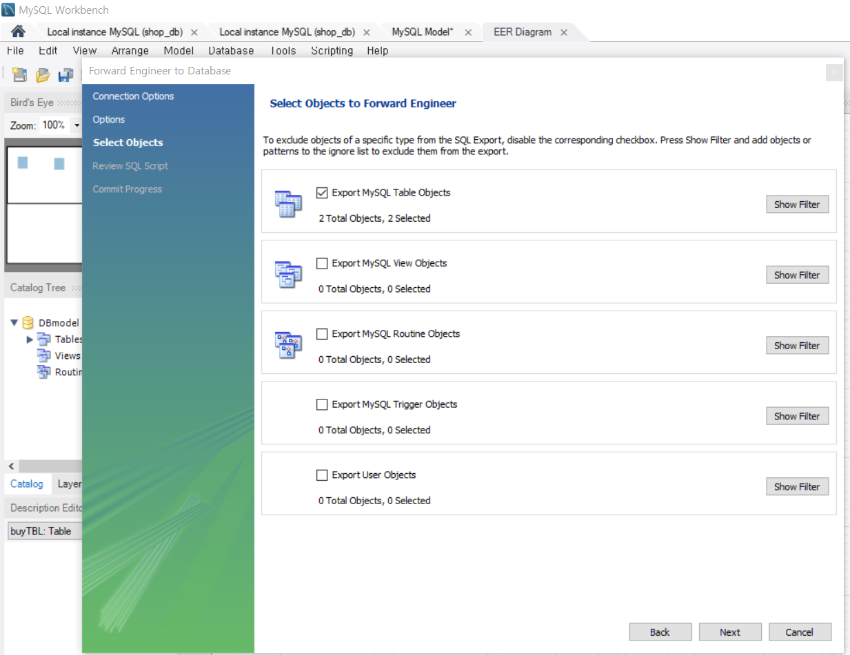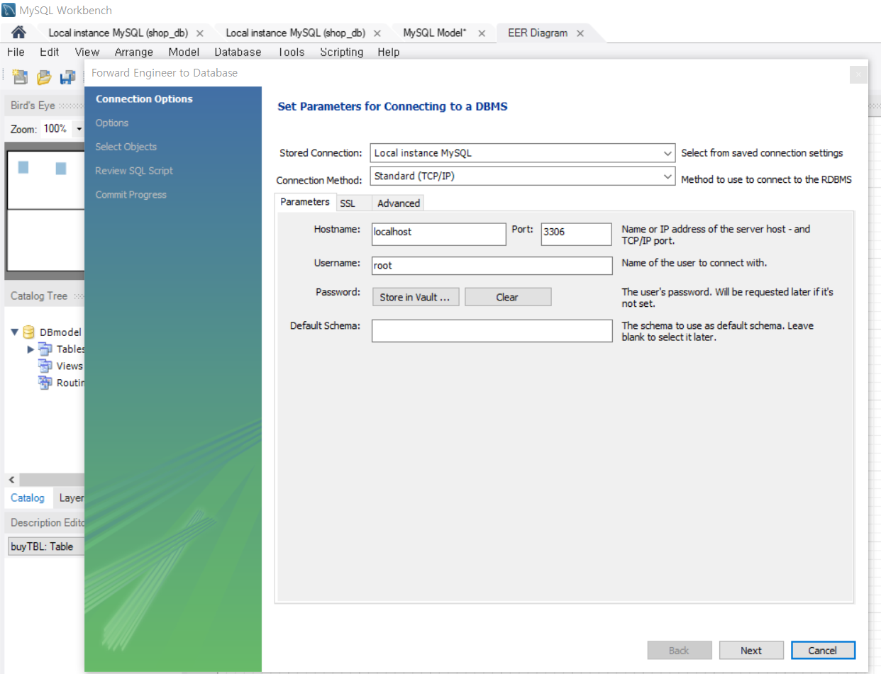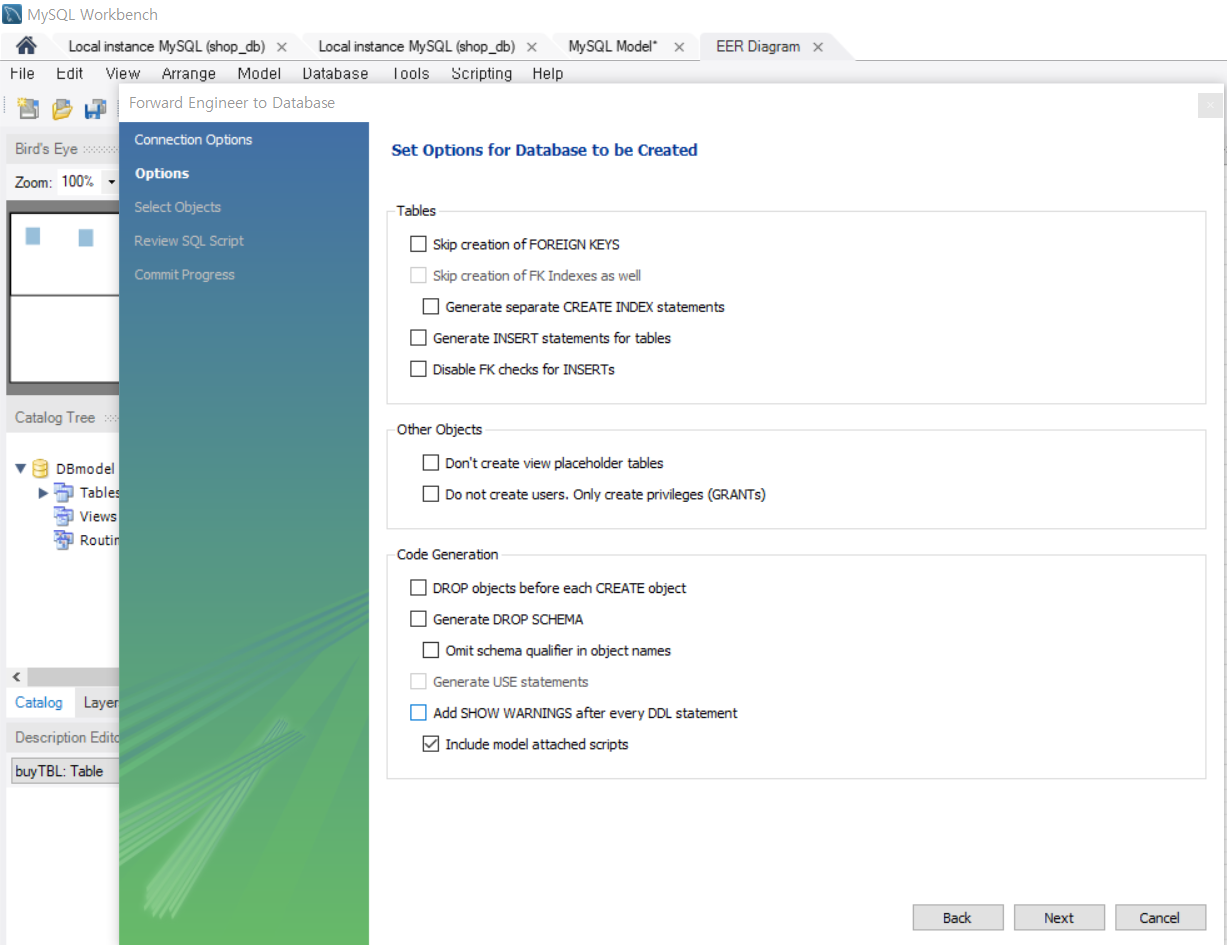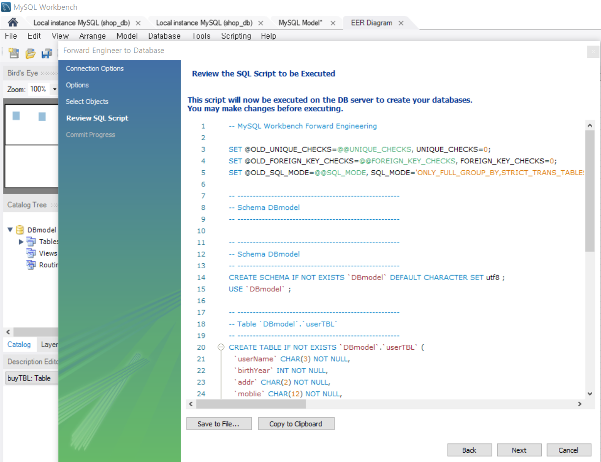 workbench 메뉴에서 database -> forward engineer 을 선택한다.