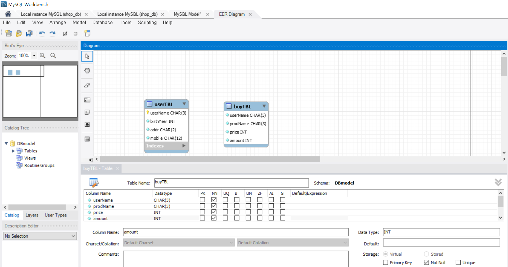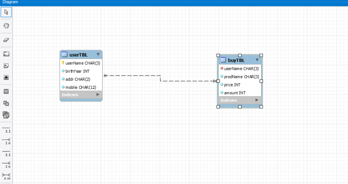 두 테이블의 1:N 관계를 맺어줄 차례이다. buyTBL열의 userName 과 userTBL의 userName 을 차례대로 클릭하면 사진과 같은 1:N관계가 다음과 같이 생성된다.