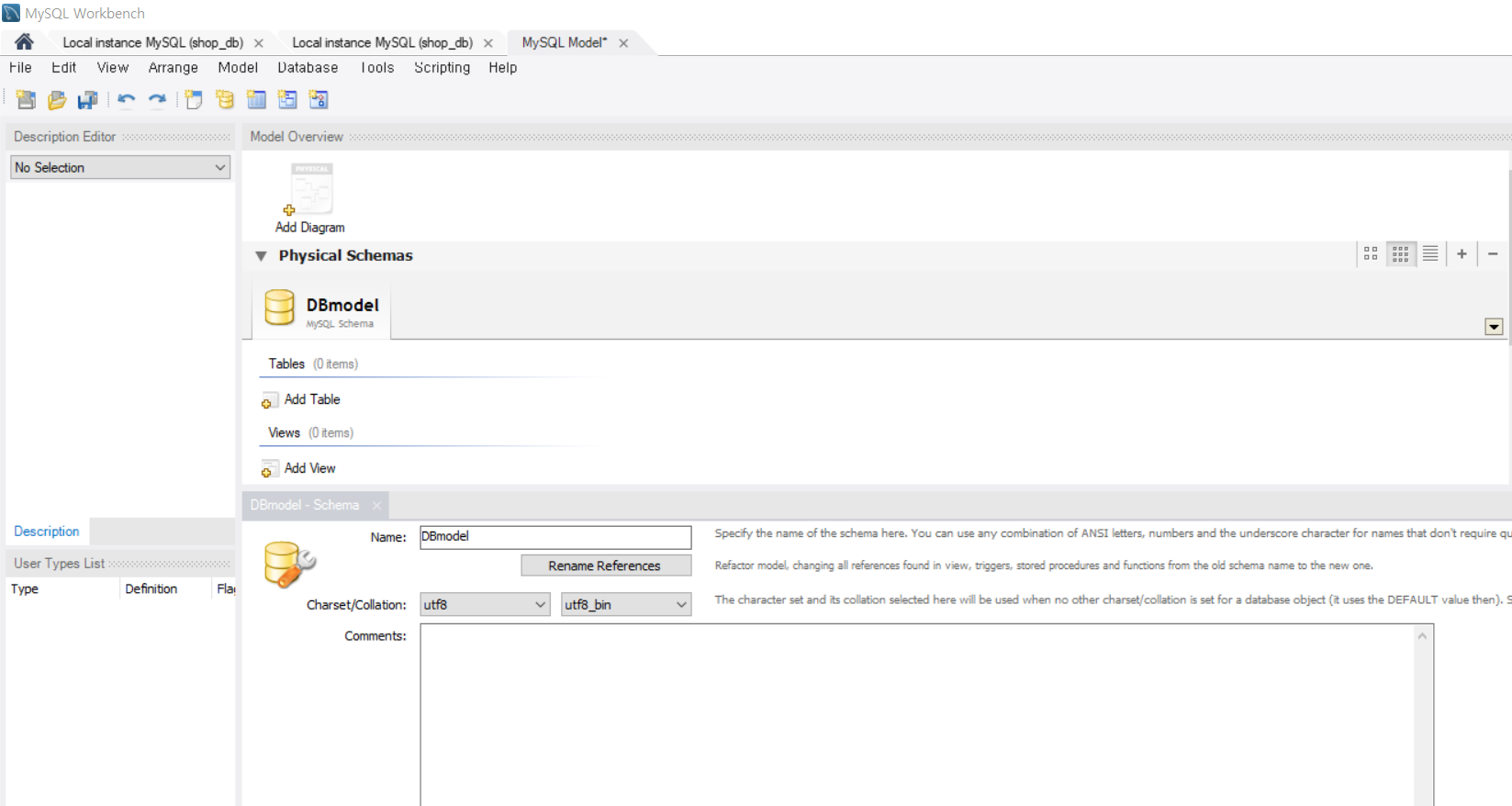 처음이름은 mydb로 만들어지게 되는데 데이터베이스에서 오른쪽 마우스 버튼을 클릭후 edit schema 를 클릭해서 이름을 변경한다.